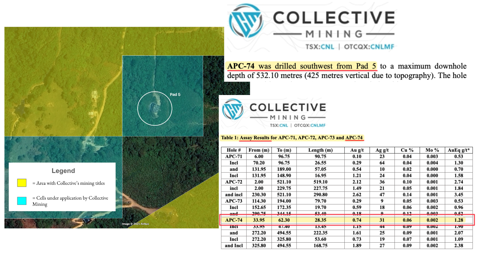 For example, Pad 5 is located in a cell that is currently untitled and is under application. In a series of press releases in late 2023, Collective announced assay results from a hole drill from Pad 5. [2]