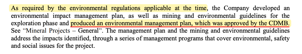 As of December 31, 2011, Eco Oro told investors that it had “produced an environmental management plan, which was approved by the CDMB,” according to the 2011 annual information form. [Pg. 9]