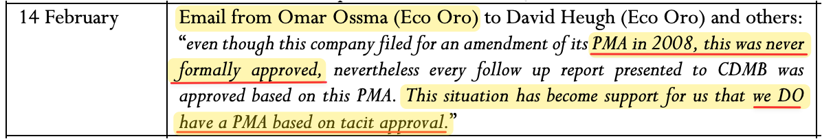 Ossma argued nonetheless that the company had a compliant environmental management plan based on “tacit approval,” according to an email he sent to the company’s Chief Operating Officer revealed in arbitration filings. [Pg. 414]