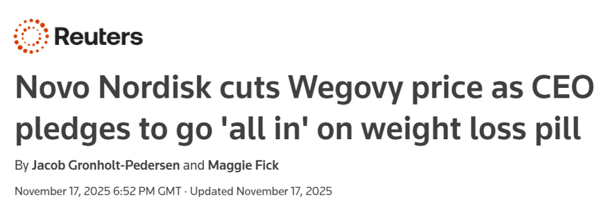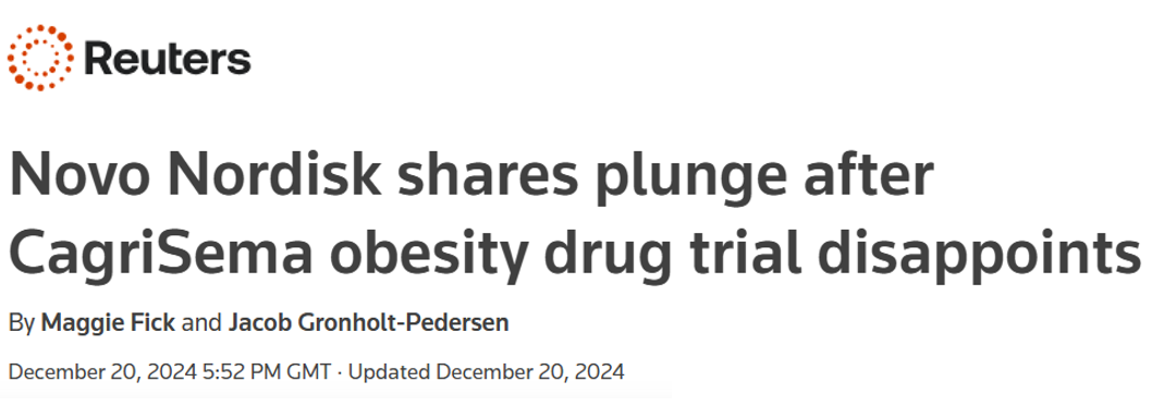 - In December 2024, Novo reported disappointing trial data for the drug. In February 2025, Novo Nordisk delayed filing for CagriSema regulatory approval due to “supply chain readiness.”