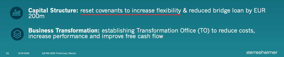 In its Q3 2025 earnings presentation, Gerresheimer stated that it had “reset covenants” to “increase flexibility” but failed to provide details around the terms of the new covenants. [Pg. 16]
