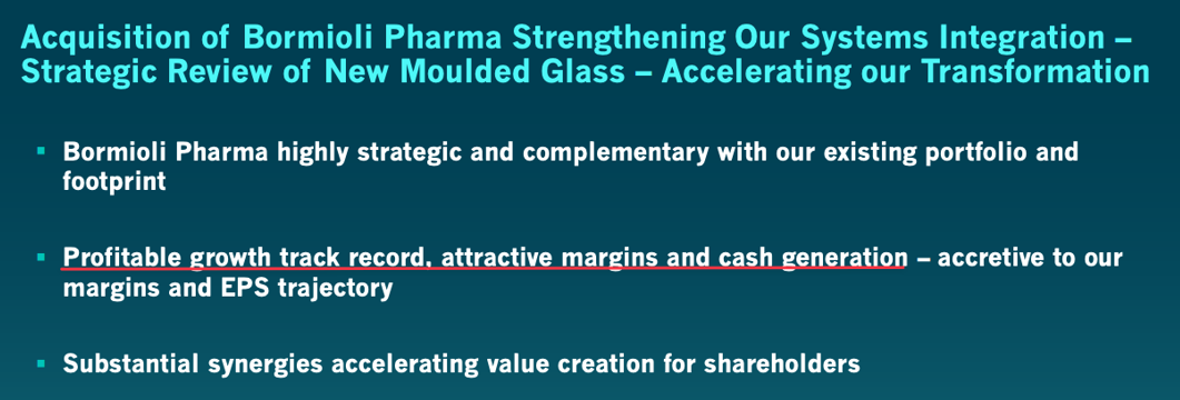 - Gerresheimer justified the price by pointing to Bormioli’s “profitable growth track record, attractive margins, and cash generation,” and by claiming “substantial synergies” between the two companies.
