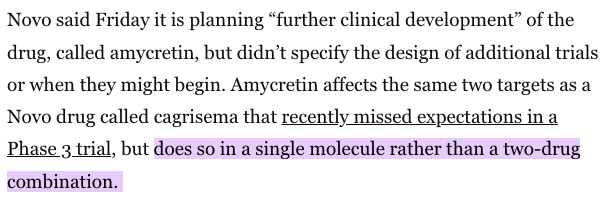 - For example, in December 2024, Novo launched a new trial for a single-chamber formulation of CagriSema. It has also publicly reported results for a new GLP-1 called Amycretin, which has demonstrated excellent results and no “weight loss plateau,” while only requiring a single-chamber syringe.