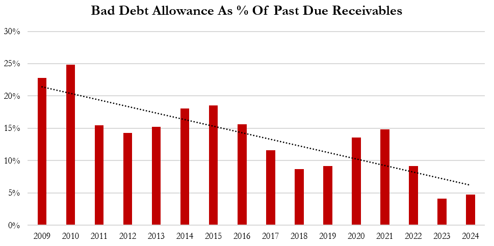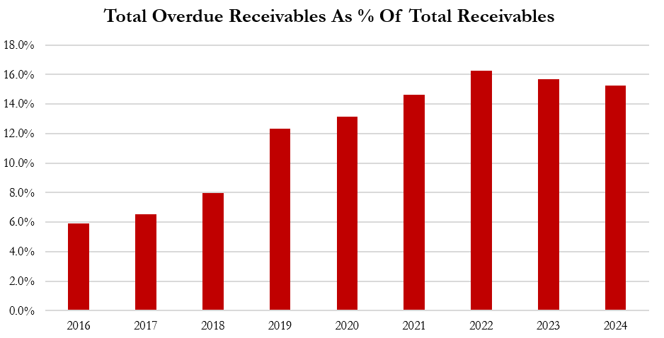 - Aggressive Accounting Practice #4: Despite record levels of overdue receivables, Gerresheimer’s provisions for bad debts are at a 15-year low, boosting operating income by an estimated ~2.5% in 2024 relative to historical provisions.