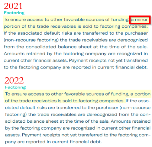 In 2021, Gerresheimer told investors that “a minor portion of trade receivables is sold to factoring companies,” per the notes of its financial statements. In 2022, however, the word “minor” was removed from the same note, implying that the use of factoring had increased.