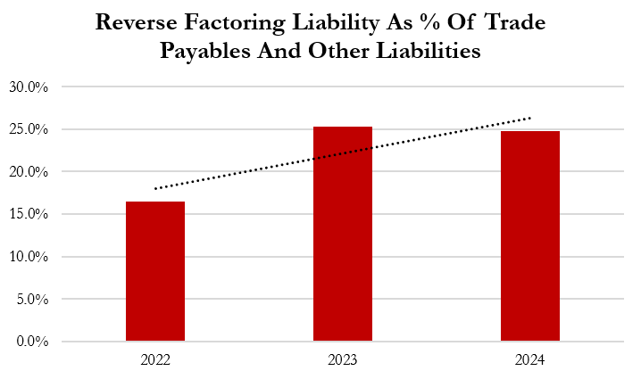 On the other hand, Gerresheimer’s supply chain finance program expanded from 16.5% of reported “trade payables and other liabilities” in 2022 to 24.7% in 2024.[1]