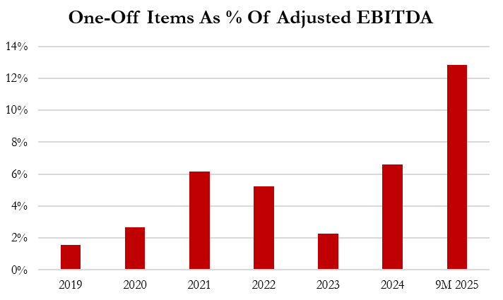 - Aggressive Accounting Practice #5: Gerresheimer increasingly relies on the removal of “one-off” expenses in its calculation of adjusted EBITDA, with these expenses more than doubling from 6.6% in 2024 to 12.8% of EBITDA in 9M 2025, including €16.6 million of opaque “restructuring costs” unrelated to the Bormioli acquisition.