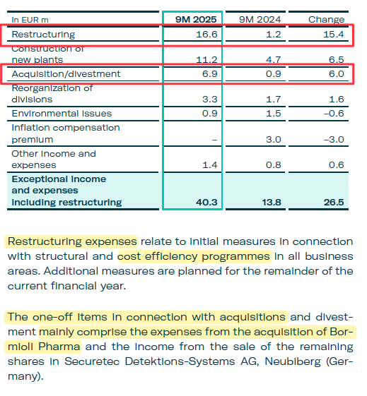 16. Gerresheimer increasingly relies on the removal of “one-off” expenses to calculate adjusted EBITDA, which skyrocketed to 12.8% of adjusted EBITDA in 9M 2025. You disclosed €16.6 million of restructuring costs, separate from the Bormioli acquisition-related expenses. What are these for? Will you provide a detailed breakdown of these costs for shareholders?