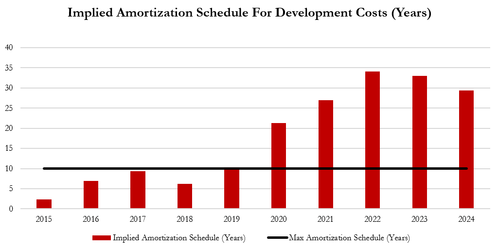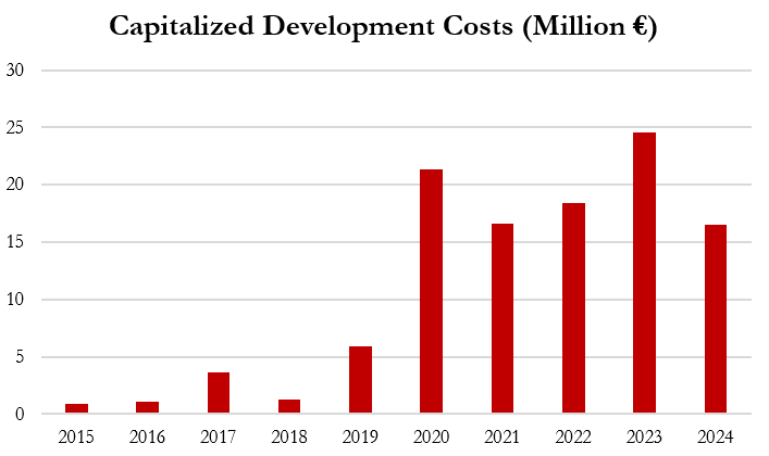 - Aggressive Accounting Practice #1: Gerresheimer has capitalized an increasing amount of “development costs” in recent years, providing immediate boosts to EBITDA & operating income. While it claims it “usually” amortizes these costs over “three to ten years,” actual charges show it is stretching these costs as far out as 34 years. This boosted 2024 operating income by ~7%.