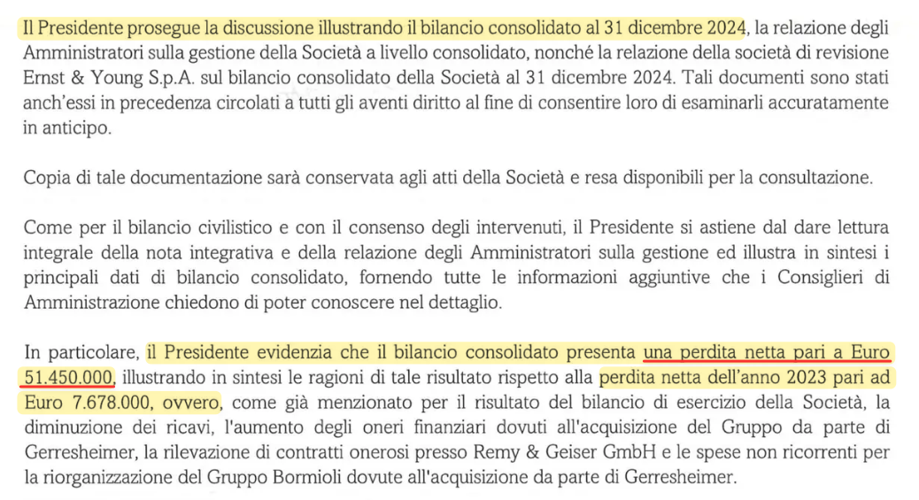 - Despite Gerresheimer’s claims, Bormioli generated a net loss of ~€8 million in 2023, accelerating to ~€51.4 million in 2024, according to the minutes of its shareholder meeting. Revenue was flat at best and potentially on the decline based on 1H 2025 sales of €166.952 million, which would require a 22% increase in the second half of the year just to maintain 2024 estimated sales.