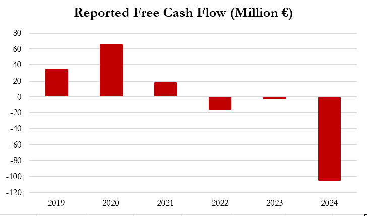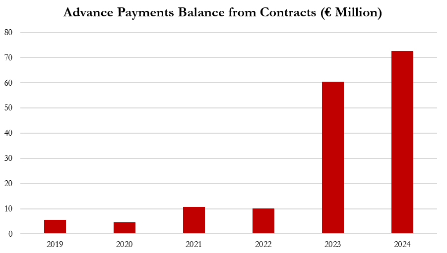 Specifically, from 2022 to 2024 the balance of advance payments that had already been received increased by €62.5 million. In the same 2-year period, the company reported €107.3 million of negative free cash flow, in absence of the advance payment we believe the company would have been 58% lower at negative €169.8 million. [Pg. 73] [Pgs. 16, 69]