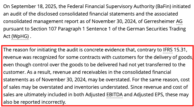 - Aggressive Accounting Practice #6: In September 2025, German regulator BaFin disclosed an investigation into Gerresheimer’s “bill-and-hold” practices, which management has claimed amounted to €28 million in 2024 with €3 million potentially being booked inappropriately in just the last quarter of 2024.