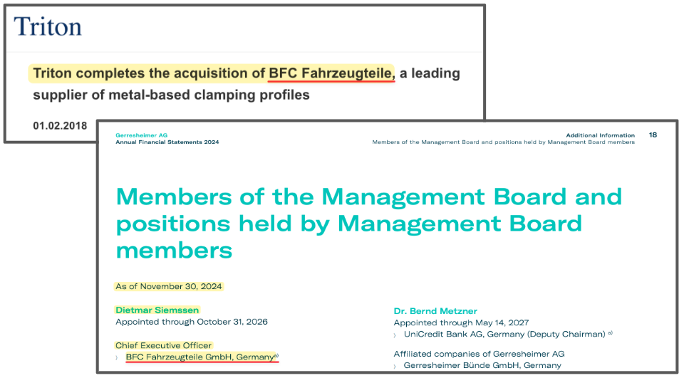 - Gerresheimer’s former CEO Dietmar Siemssen, who presided over the acquisition and negotiation with Bormioli’s owner Triton Partners, was simultaneously moonlighting as CEO at a portfolio company of Triton Partners. A former Gerresheimer executive told us this represented a “compliance question” due to his connections to Triton.